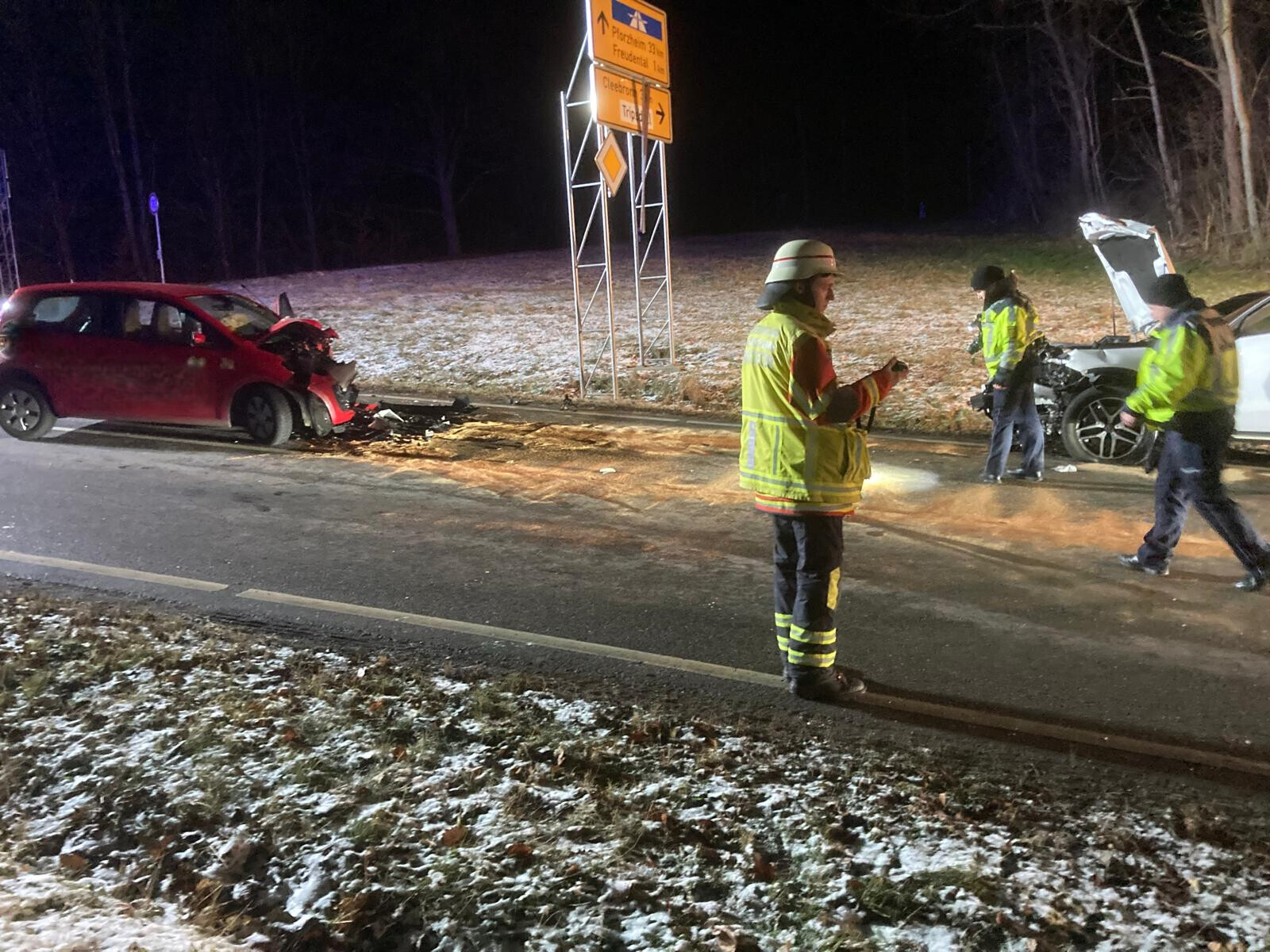Auf der Landstraße zwischen Bönnigheim und Freudental, Höhe Parkplatz Krappenberg, kam es in der Kurve zu einem Frontalzusammenstoß zweier PKWs. Die vier Fahrzeuginsassen waren nicht eingeschlossen und konnten ihre Fahrzeuge selbstständig verlassen. Die ersteintreffenden Kräfte betreuten und versorgten die drei verletzten Personen, bis weitere Rettungsmittel eintrafen. Weiterhin wurde die Unfallstelle weiträumig abgesperrt, die betroffenen Fahrzeuge gesichert, sowie auslaufende Betriebsmittel aufgenommen. Im weiteren Verlauf wurde der GW-L2 nachalarmiert, um das HLF auszulösen und die Unfallstelle weiterhin auszuleuchten und Aufräumarbeiten vorzunehmen.